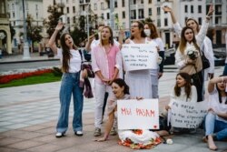 В Минске около 250 женщин выстроились в цепь со словами "Прекратите нас бить! Нам просто нужен правильный подсчет голосов!".