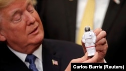 В июле прошлого года президент Трамп принимал в Белом доме по случаю 50-летия высадки американцев на Луне членов экипажа корабля "Аполлон-11", совершившего ту экспедицию, – Майкла Коллинза и Базза Олдрина, – и директора Национального агентства по аэронавтике и исследованию космоса Джима Брайденстайна.