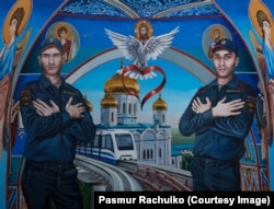 Это на самом деле пошло не от Навального. Еще за год до Навального эта картина разошлась по сети как "икона Росгвардии". Это очень странная фигня. Потому что там на шевронах написано "Полиция". Потом даже вышли заметки по поводу того, что я хайпую на строительстве храма, о котором я узнал только из этих заметок.