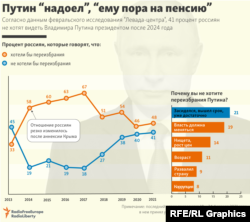 По данным исследования "Левада-центра", проведенного в феврале 2021 года, 41 процент россиян не хотят видеть Владимира Путина президентом после 2024 года. Половина из них говорят, что "президент засиделся, надоел и ему пора на пенсию". Только 8 процентов опрошенных завили, что хотят смены президента из-за коррупции. При этом альтернативы Путину большинство россиян до сих пор не видит.