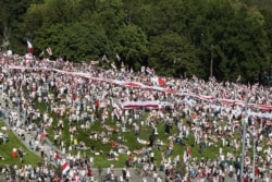 Участники гражданского марша "За свободу" заполняют площадь Независимости в центре Минска. Постамент памятника Ленину уже обклеен плакатами: