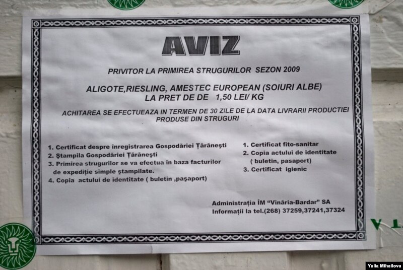 Fabrica de vin din Bardar dă pe kilogramul de struguri cel mult 1 leu 50 de bani şi primeşte numai soiuri albe europene. Ţăranii pe care-i întîlnesc aici se arată nemulţumiţi de preţ, dar şi de faptul că au nevoie de un teanc de acte care să certifice calitatea roadei, iar ciorchinii trebuie să-i care de pe deal numai în remorci corespunzătoare, ceea ce ar însemna cheltuieli în plus.