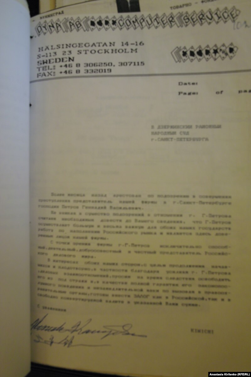 В деле обнаружился документ, оформленный на бланке шведской фирмы Dyna AB Computer Service. В письме говорилось, что арестованный Геннадий Петров - это доверенное лицо фирмы Dyna в России, и он является "добросовестным представителем российского делового мира". Подписавший письмо некий "KINICHI" (имя было напечатано прописными буквами) просил отпустить своего коллегу под залог. Логотип компании Dyna был стилизован под россыпь игральных карт.