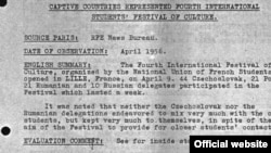 Unul din documentele cele mai interesante îl constituie o relatare redactată la 24 aprilie 1956 de către Biroul de știri al Europei Libere de la Paris, pe marginea celui de-al patrulea Festival Internațional Cultural al Studenților, desfășurat în Franța, la Lille, și organizat sub auspiciile Uniunii Naționale a Studenților Francezi (UNEF) și sub patronajul președintelui Franței, René Coty.