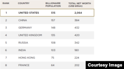 В мире сейчас насчитывается 2170 человек, обладающих состоянием в один миллиард долларов и больше. Совокупное богатство миллиардеров в Азии выросло за последний год на 13 процентов, это больше, чем в любой другой части света. Единственным континентом, где число миллиардеров сократилось за последний год, была Европа – минус 29 человек. Состояние азиатских миллиардеров, по прогнозам, сравняется по своему объему с состоянием североамериканских сверхбогачей в течение ближайших пяти лет. За последний год число миллиардеров в Азии выросло более чем на три с половиной процента. Все это, по мнению авторов доклада, отражает "тектонические сдвиги" в мировой экономике.