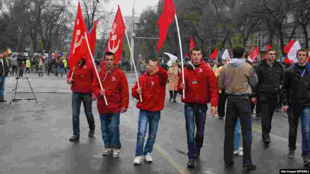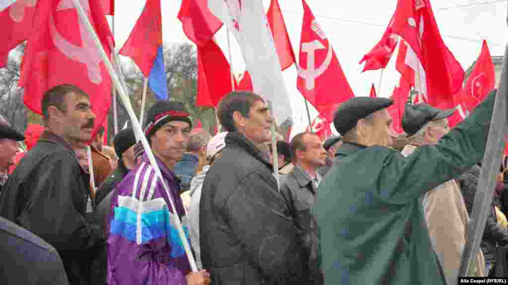 Partidul comuniștilor a organizat în centrul capitalei un miting de protest împotriva guvernării, căreia îi cere să demisioneze și să convoace alegeri anticipate. Comuniștii vor de asemenea ținerea unui referendum pentru aderarea țării la Uniunea Vamală dominată de Federația Rusă. Potrivit site-ului Unimedia în Piața Marii Adunări Naționale s-au adunat și câteva zeci de persoane care demonstrează împotriva comuniștilor, pentru integrarea europeană. PCRM a dat un ultimatum puterii de a demisiona până la 21 noiembrie, amenințând în caz contrar cu proteste masive. Foto: Alla Ceapai.