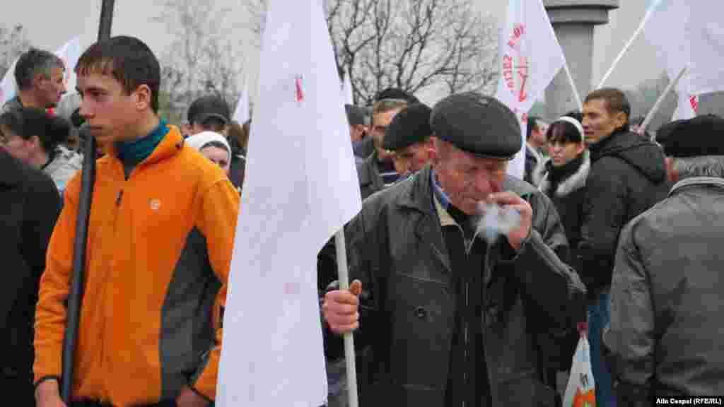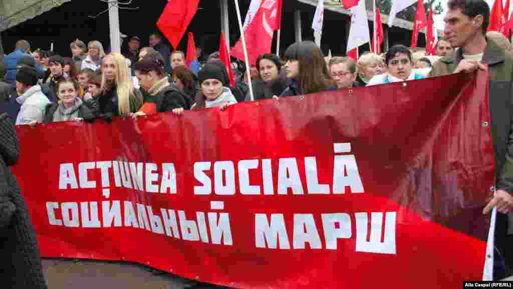 Partidul comuniștilor a organizat în centrul capitalei un miting de protest împotriva guvernării, căreia îi cere să demisioneze și să convoace alegeri anticipate. Comuniștii vor de asemenea ținerea unui referendum pentru aderarea țării la Uniunea Vamală dominată de Federația Rusă. Potrivit site-ului Unimedia în Piața Marii Adunări Naționale s-au adunat și câteva zeci de persoane care demonstrează împotriva comuniștilor, pentru integrarea europeană. PCRM a dat un ultimatum puterii de a demisiona până la 21 noiembrie, amenințând în caz contrar cu proteste masive. Foto: Alla Ceapai.