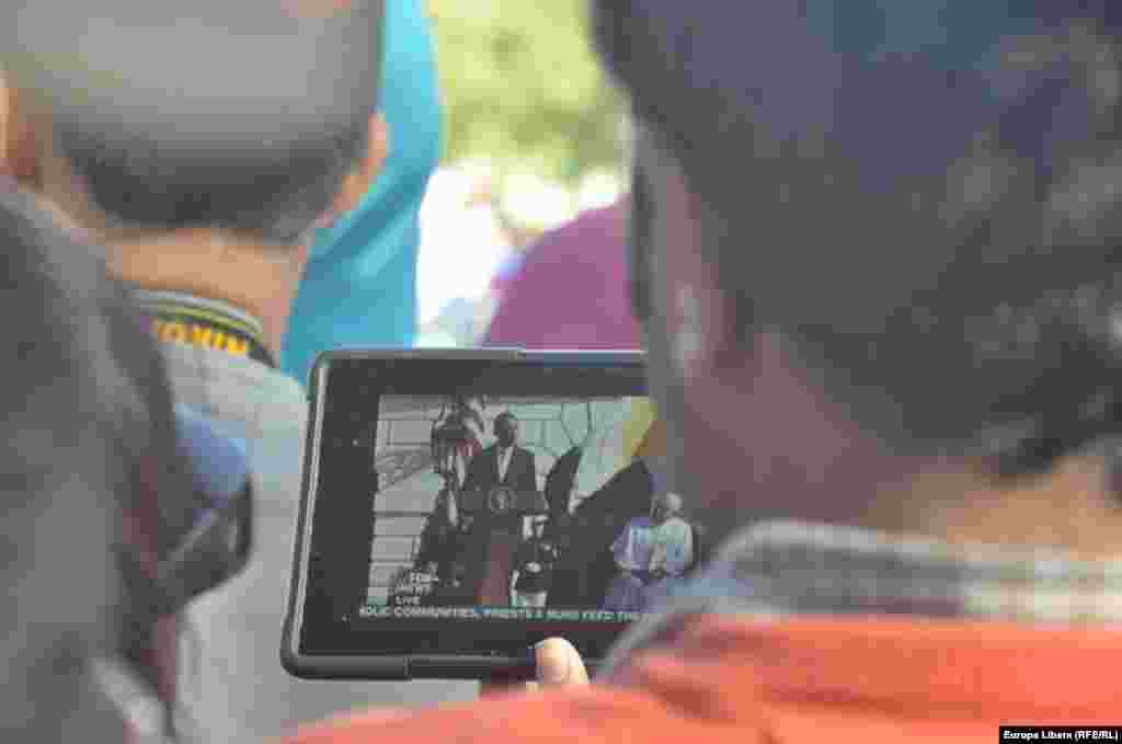 Președintele Barack Obama și prima doamnă îl întâmpină pe Papa Francisc la Casa Albă. Miile de oameni prezenți pe Constitution Avenue, în apropierea Obeliscului George Washington, ascultă și privesc, pe monitoare gigantice...