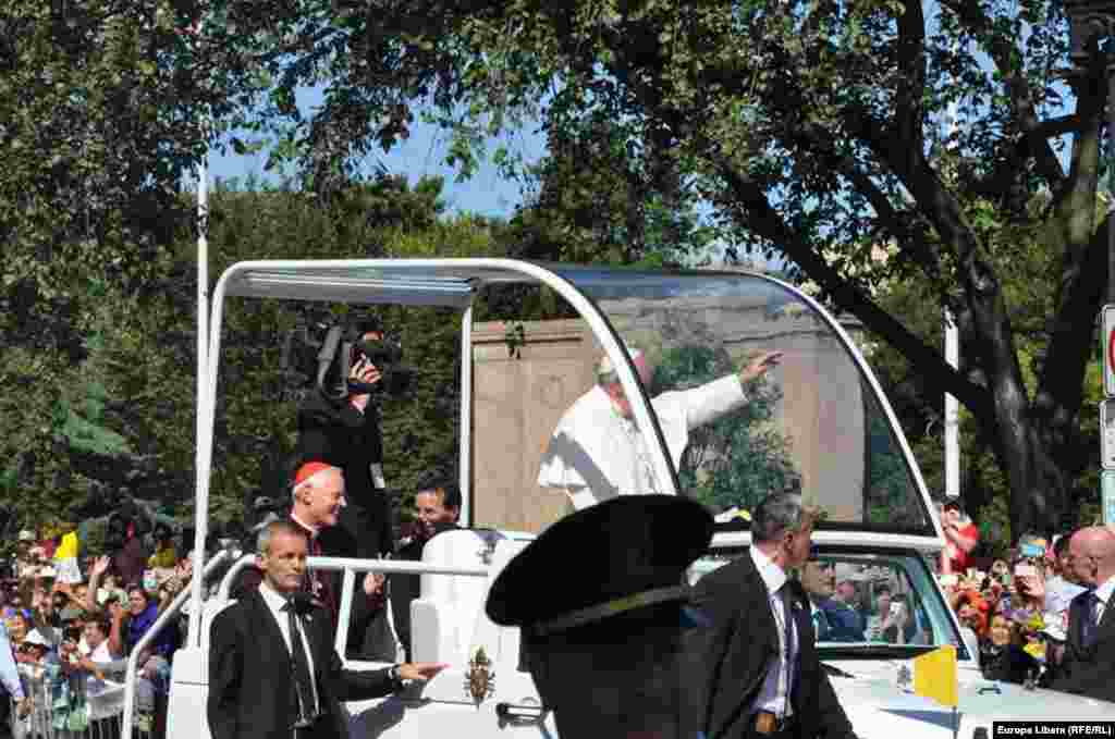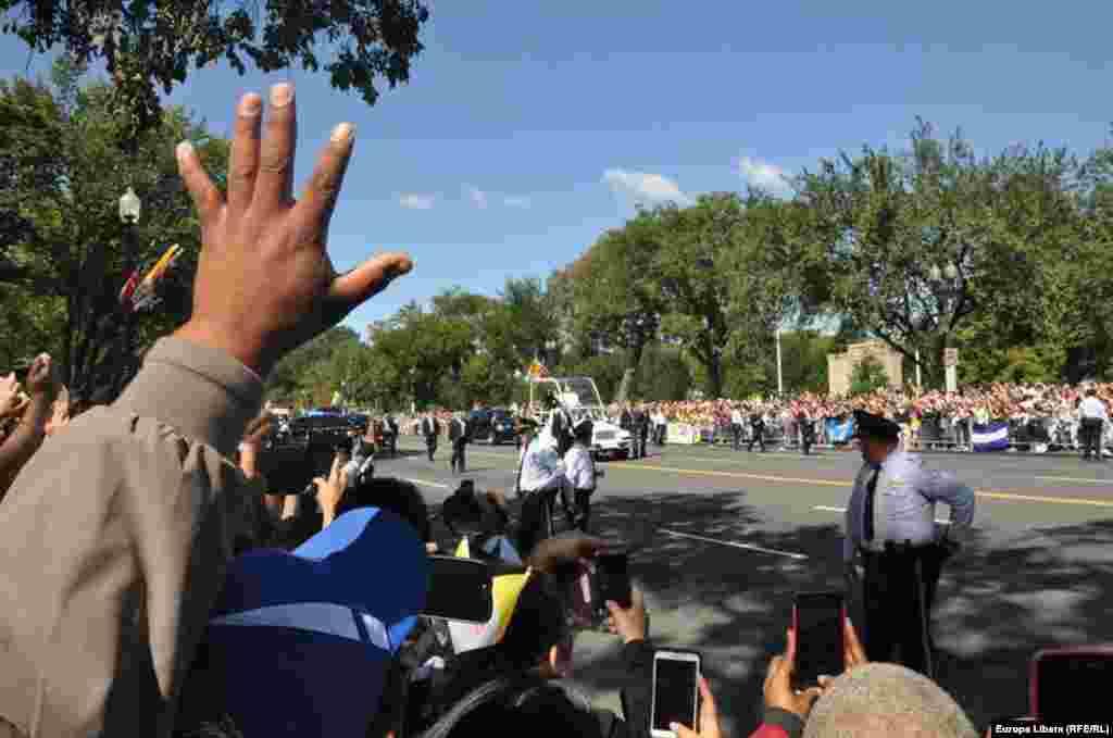 23 septembrie 2015: Președintele Barack Obama și prima doamnă îl întâmpină pe Papa Francisc la Casa Albă. Miile de oameni prezenți pe Constitution Avenue, în apropierea Obeliscului George Washington, ascultă și privesc, pe monitoare gigantice sau pe propriile tablete și telefoane mobile, vădit emoționați, cele două discursuri importante: al Papei și al președintelui. Când suveranul pontif ia pentru prima oară cuvântul, se așterne o tăcere ceremonioasă prin care doar adierea vântului de vară indiană își mai face loc. Grupurile de oameni izbucnesc în aplauze și urale când Papa Francisc își încheie emoționantul salut cu „God bless America”. A vorbit calm, măsurat, într-o engleză impecabilă, despre sărăcie, schimbarea climei, despre imigrație și solidaritate. A fost cât se poate de pastoral, și mai puțin doctrinar. A impresionat miile de oameni prezenți, peste 11.000 potrivit New York Times, printr-o agendă corectă de priorități, dublată de o invitație directă la responsabilitate morală. După discursuri și micul program artistic din fața Casei Albe, suveranul pontif a fost purtat de papamobil pe traseul paradei de pe Ellipse și o parte din National Mall. Imagini de la istoricul eveniment, într-un fotoreportaj de Marius Stan: