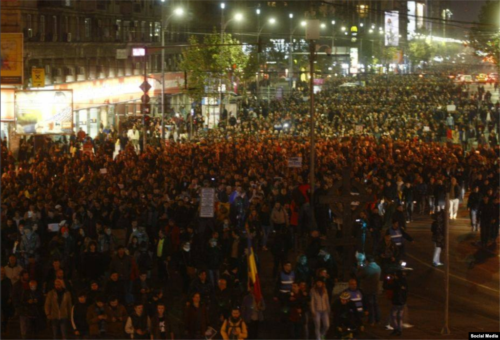 Protestatarii au ieșit în stradă strigînd „Corupția ucide!”, o aluzie la delăsarea autorităților care permit funcționarea de cluburi și de discoteci fără respectarea normelor de prevenire a incendiilor, și de salvare în caz de incendii. Vineri 30 octombrie, 27 de persoane și-au pierdut viața pe loc - altele cinci au decedat ulterior la spital - după declanșarea unui incendiu la clubul Colectiv în timpul concertului formației Goodby to Gravity. Între cei decedați se află și doi dintre membrii trupei