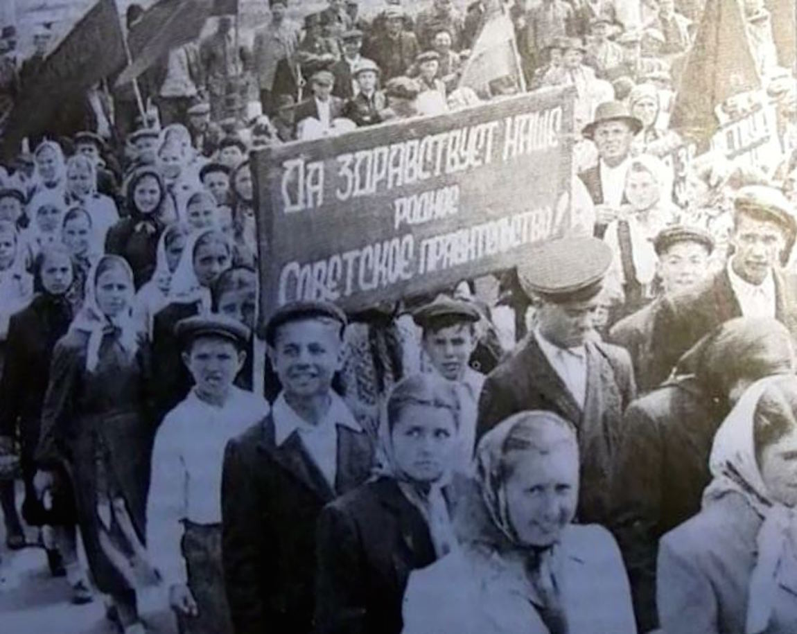 Sora mai mare Anastasia (a doua din dreapta, rândul de jos), la o demonstrație de sărbătoare în perioada sovietică. Pe pancartă scrie în limba rusă: „Să trăiască dragul nostru guvern sovietic”. Cișmichioi, circa începutul anilor 1960