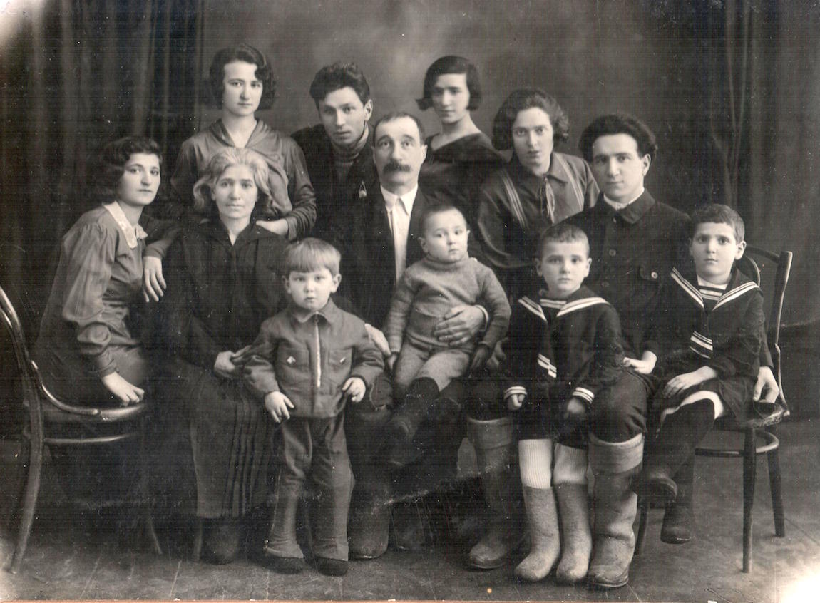 Bunica Marianna Pereberina (rândul de sus, dreapta). Străbunica Elizaveta Fișman (al doilea rând, a doua din stânga) alături de străbunic, Ilia Fișman. Străbunicul e orb. Ural, 1933