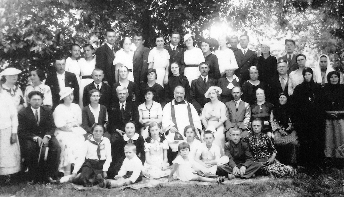Comunitatea poloneză după serviciul religios de hramul bisericii, printre care și mama Ekaterinei Iajgunovici (dreapta, așezată). „Pe originalul fotografiei, mama și-a zgâriat fața, nu-i plăcea cum arată”, a spus Ekaterina. Soroca, 1936