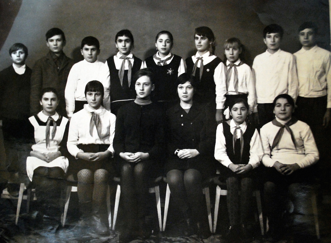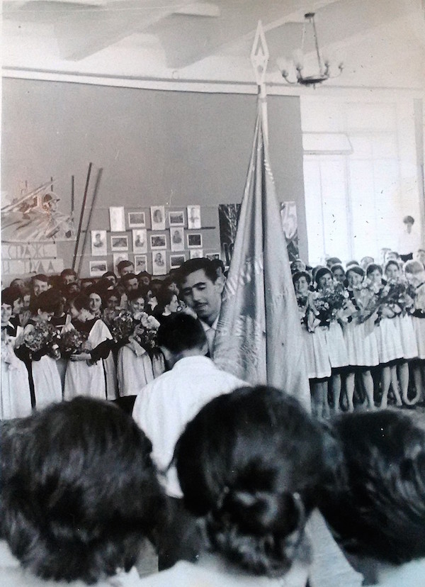 Ghenadi Babaean înmânează stema școlii la ceremonia de absolvire a clasei 11. Sumgait, Azerbaidjan, 1965
