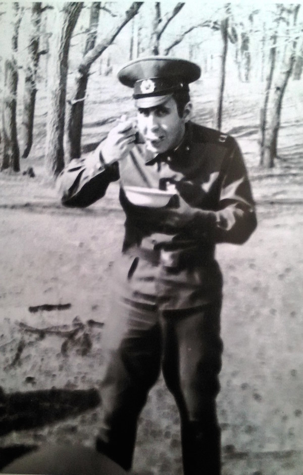 Ghenadi Babaean la armată, fotografie trimisă soției Tatiana. Pe verso: „Soțul tău e atât de înfometat, încât înghite mâncare fierbinte”. Samara, Rusia, 1973