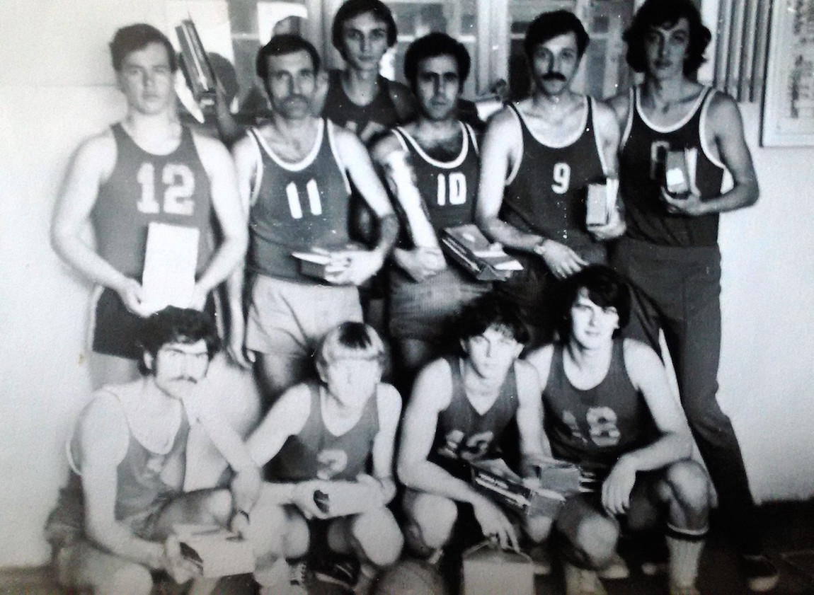 Ghenadi Babaean în tricoul cu numărul 10, alături de membrii echipei de baschetbal. Au obținut titlul de campioni ai Azerbaidjanului. Stepanakert, autoproclamata republică Nagorno-Karabah, 1975