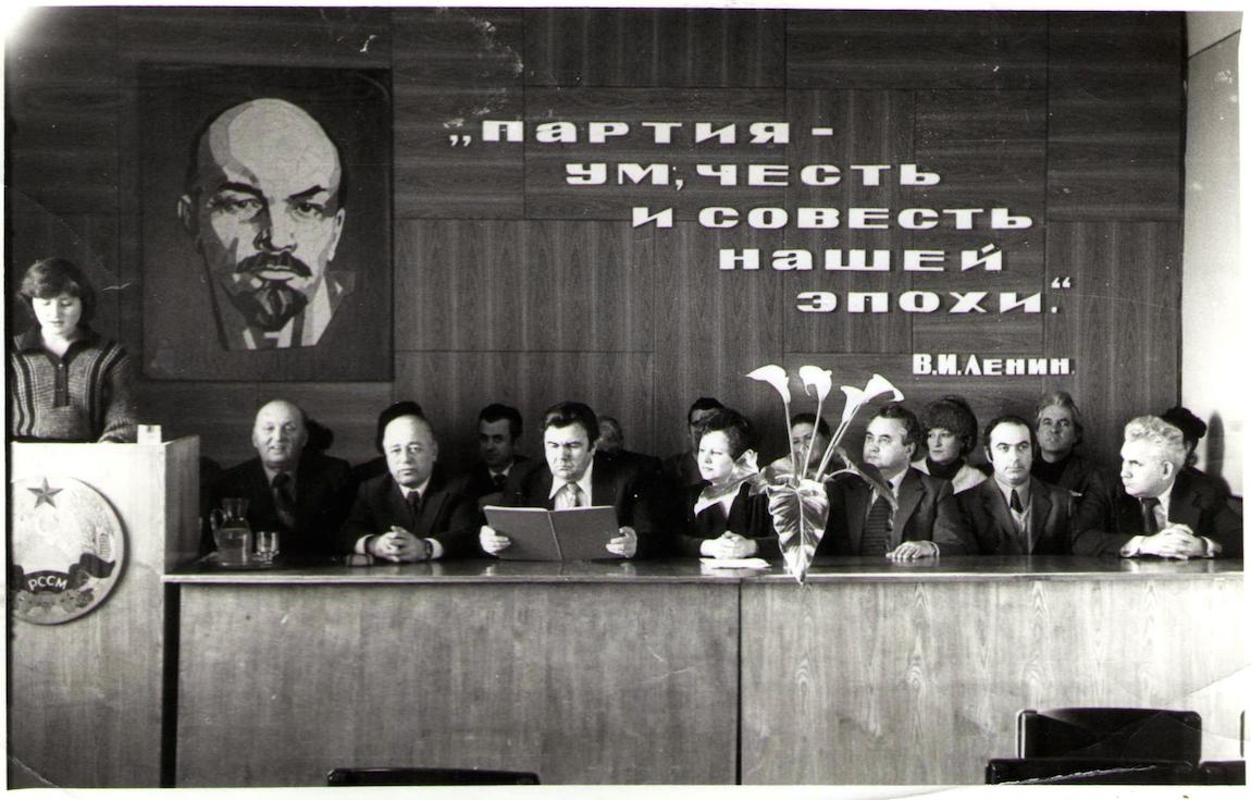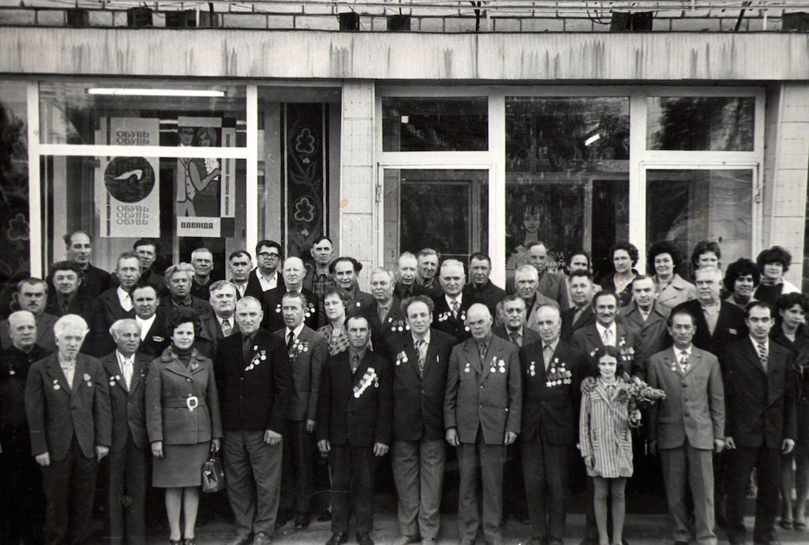 Ședință de producție la uzina în care lucra Leon Akkerman (primul rând, al doilea din dreapta). Edineț, 1975