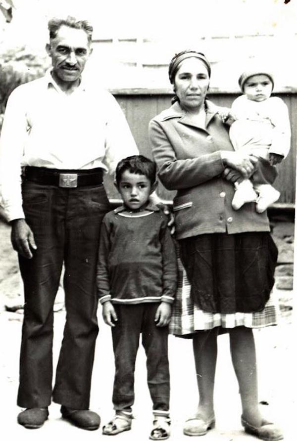 Marin Alla alături de părinți și frate. Satul Ursari, 1980