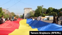 Panglici tricolore s-au prin azi la piept, le-au agățat și șoferii la automobile în semn de sărbătoare. Cu un tricolor mai mare însă, de circa 100 de metri au mărșăluit pe străzi din centrul capitalei, membrii Asociației unioniste „Onoare, Demnitate și Patrie”.