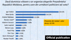 Liderii partidelor de opoziţie, Igor Dodon, Maia Sandu şi Andrei Năstase par să aibă cele mai mari şanse într-un eventual scrutin prezidențial. La mare distanţă se poziţionează liderul comuniştilor Vladimir Voronin, care ar acumula un scor dublu faţă de Iurie Leancă, care a anunţat că participă în cursă, dar şi faţă de Marian Lupu un eventual candidat al democraţilor. Prognozele sunt foarte aproximative, spun autorii sondajului, precizând că mai mult de treime din respondenţi nu ştiu deocamdată pentru cine ar vota.