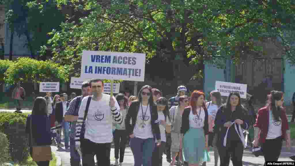 Zeci de jurnalişti au participat astăzi la un Marş al Solidarităţii Presei, organizat de Centrul pentru Jurnalism Independent, în contextul Zilelor Libertăţii Presei (3-30 mai). Jurnaliştii au marşăluit de la Casa Presei spre Guvern şi Parlament. În faţa Legislativului au scandat, între altele, „Libertate Presei”, „Vrem acces la informaţii”, „Stop concentrare”, „Jos Propaganda”. Prin această acțiune pașnică, organizatorii spun că şi-au propus să arate cât de solidari sunt cei care reprezintă breasla jurnalistică, deși activează în redacții diferite, dar și să le reamintească celor de la guvernare că presa nu trebuie să reprezinte o țintă pentru politicieni.