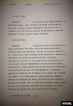 NARRATOR: Leonida Lari este una din marele poete basarabene. Ea a făcut parte din conducerea mişcării naţional-democrate basarabene, încă de la începutul afirmării ei. Figură de înalt prestigiu moral, dublată de o apariţie de mare efect la mitingurile publice şi de o vorbitoare carismatică, Leonida Lari nu pierde nici un prilej pentru a-şi declara răspicat angajamentul politico-social profund anticomunist. Uriaşa popularitate de care se bucură poeta este ilustrată poate cel mai bine de alegerea ei în Congresul deputaţilor poporului de la Moscova. Ea a reuşit să-l învingă în alegeri, în circumscripţia în care a candidat compusă aproape în întregime din ţărani, pe ministrul de interne al Republicii Moldova, care i-a fost contracandidat. Eseul poetei, pe care vă invităm să-l ascultaţi în continuare, ne-a fost transmis de Leonida Lari prin telefon de la Chişinău.