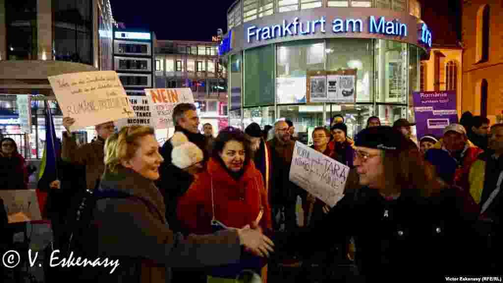 Cîteva zeci de români din Frankfurt și zona înconjurătoare și-au manifestat astăzi cu seriozitate și bun umor solidaritatea cu doleanțele sutelor de mii de protestatari din România.