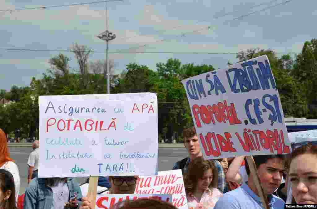 La Chișinău a avut loc o manifestație pentru îmbunătățirea calității apei din școli și grădinițe, în cadrul căreia a fost înmânată o petiție guvernului. Potrivit IPN, președinta uneia din asociațiile care au organizat demonstrația, Alla Revenco, a spus că există o „incidență foarte mare a probelor de apă neconformă, fapt care poate duce la boli serioase pentru copii”. Revenco a mai spus că problema s-ar putea soluționa fie prin asigurarea aprovizionării cu apă de calitate a instituțiilor de învățământ, fie prin aprovizionarea lor temporară cu apă îmbuteliată, urmată de instalarea de apeducte noi și a unor cișmele cu apă potabilă în școli.
