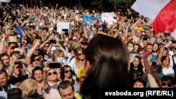 „Iubim. Putem. Vom învinge”. Candidata opoziției belaruse Sviatlana Țihanouskaia a adunat mii de susținători înainte de votul prezidențial
