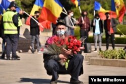 Numeroși manifestanți au defilat cu drapele în culorile așa-numitei panglici „Sf. Gheorghe”, asociate cu naționaliștii ruși, dar și drapelele R. Moldova.