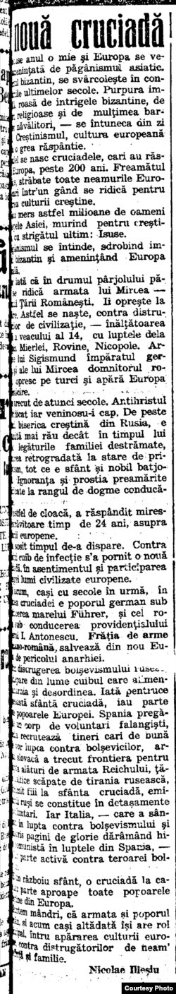 „O astfel de cloacă a răspândit miresmele otrǎvitoare ale unei rase jidoveşti inferioare timp de 24 de ani asupra culturii europene. / I-a sosit timpul de-a dispare. Contra acestui cuib de infecţie s-a pornit o nouǎ cruciadǎ în asentimentul şi în participarea întregei lumi civilizate europene. / Şi acum, ca şi cu secole în urmǎ, în fruntea cruciadei e poporul german, sub conducerea marelui Führer, şi cel român sub conducerea providenţialului general I. Antonescu. Frăţia de arme germano- românǎ salveazǎ din nou Europa de pericolul anarhiei. / Prin distrugerea bolşevismului rusesc va dispare din lume cuibul care alimenteazǎ anarhia şi desordinea. Iatǎ pentruce în aceastǎ sfântǎ cruciadǎ, iau parte toate popoarele Europei. Spania pregǎteşte un corp de voluntari falangişti, Suedia recruteazǎ tineri cari de bunǎ voie vor lupta contra bolşevicilor, armata slovacǎ a trecut frontiera pentru a lupta alǎturi de armata Reichului, ţǎrile baltice scǎpate de tirania ruseascǎ, îşi trimit fiii la sfânta cruciadǎ, emigranţii ruşi se constituie în detaşamente de voluntari. Iar Italia, – care a sângerat în lupta contra bolşevismului şi a înscris pagini de glorie dǎrâmând hidra masonicǎ în luptele din Spania – va lua parte activǎ contra teroarei bolşevice. / E un rǎzboi sfânt, o cruciadǎ la care iau parte aproape toate popoarele creştine din Europa. / Suntem mândri, cǎ armata românǎ şi poporul român, şi acum caşi altǎdatǎ îşi are rol principal întru apǎrarea culturii europene contra distrugǎtorilor de neam, credinţǎ şi familie.”
