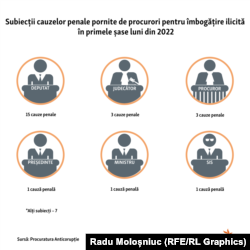 În ultimii trei ani, Procuratura Anticorupție a demarat 45 de cauze penale pentru îmbogățire ilicită, alte 15 fiind pornite de Centrul Național Anticorupție. Din cele 60 de dosare, în instanța de judecată a ajuns unul singur, în care este vizat Ruslan Popov, ex-adjunctul procurorului general suspendat, Alexandr Stoianoglo.