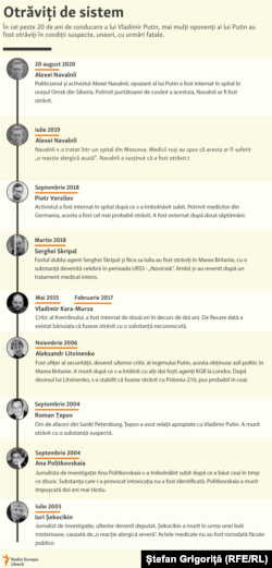 Doar că Navalnîi nu este primul caz de rival al lui Putin care este atacat. Vladimir Kara-Murza, Sergei Skripal și fiica sa, Alexander Litvinenko sunt doar câteva cazuri din 2015 încoace în care adversari politici ai regimului de la Moscova au fost otrăviți.