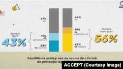 71% dintre români sunt de părere că legalizarea căsătoriei pentru familiile de același sex nu ar avea niciun impact asupra propriilor vieți, confirmând astfel rezultatul înregistrat la Referendumul pentru redefinirea familiei în Constituție, când aproximativ 80% dintre alegători nu s-au prezentat la vot. Sondajul a fost făcut la comanda organizației Accept, de Cult Market Research cu sprijinul financiar al Fundației Friedrich Nauman.