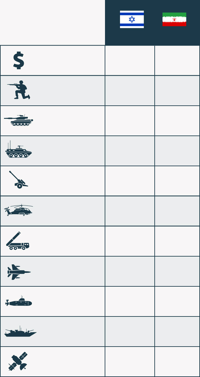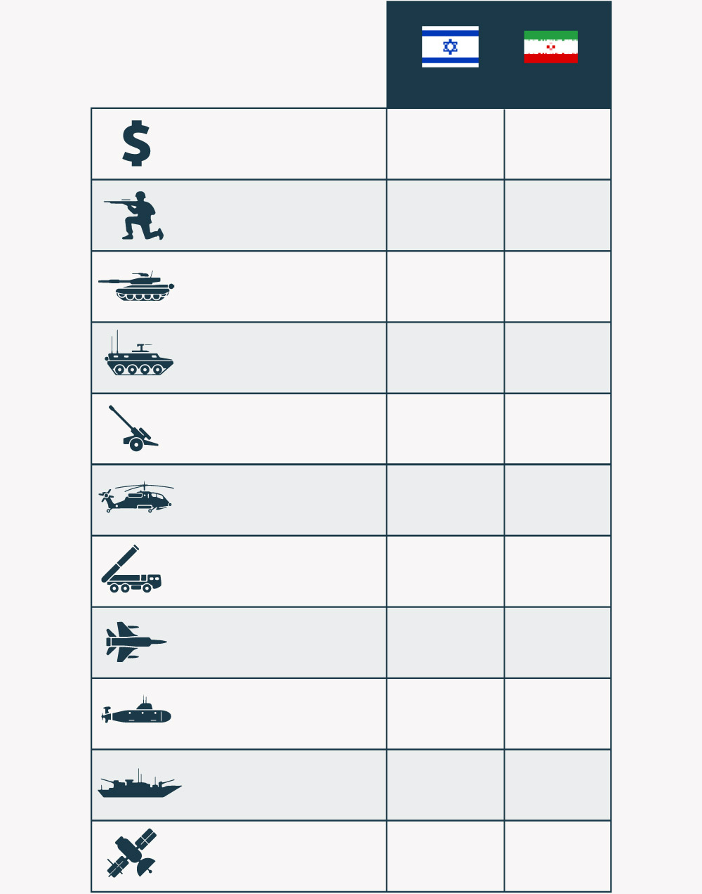 Israelul și Iranul sunt puteri militare majore în regiune. Armata Israelului este comparativ mai mică, dar tehnologic avansată și bine echipată. Iranul are superioritate numerică, dar forțele sale armate se bazează pe tehnologie învechită în domenii precum aviație cu echipaj și blindate.