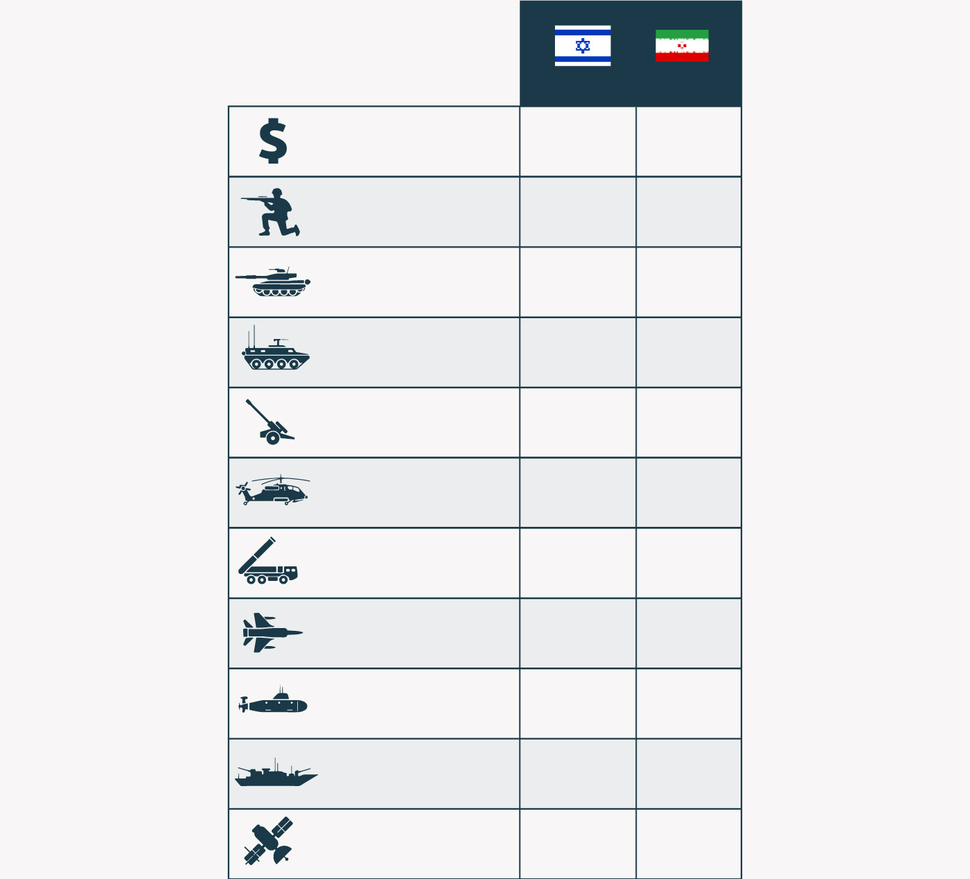 Israelul și Iranul sunt puteri militare majore în regiune. Armata Israelului este comparativ mai mică, dar tehnologic avansată și bine echipată. Iranul are superioritate numerică, dar forțele sale armate se bazează pe tehnologie învechită în domenii precum aviație cu echipaj și blindate.