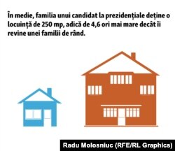 Prin urmare, în medie, un familia unui candidat la prezidențiale deține o locuință de 250 m.p., adică de 4,6 ori mai mare decât a unei familii de rând.