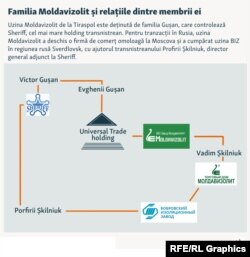 Nici Profirii Șkilniuk, fostul director al uzinei Moldavizolit din Tiraspol, nici Igor Kolokolov, directorul filialei rusești, TD Moldavizolit, și al uzinei BIZ din Sverdlovsk deținută de familia Șkilniuk, nu au răspuns la scrisori și apeluri ale Europei Libere în legătură cu tranzacțiile documentate de noi.