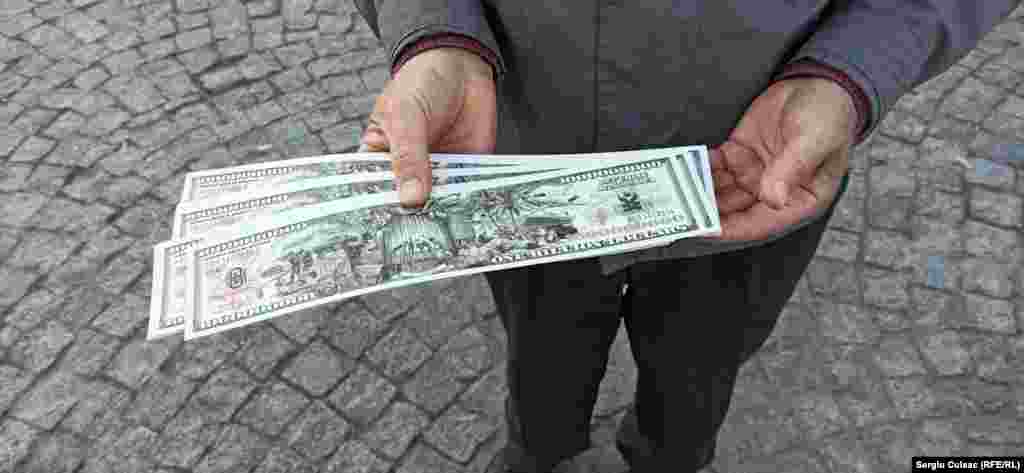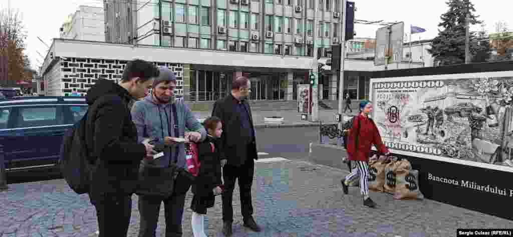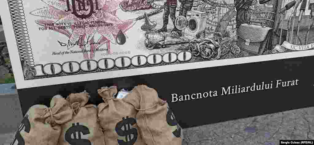 Opt saci cu "bancnote" în valoare de un miliard de dolari și un panou lung de șase metri au fost amplasate peste drum de sediul BNM din Chișinău. Sunt ilustrate personaje-cheie și momente legate de devalizarea sistemului bancar.