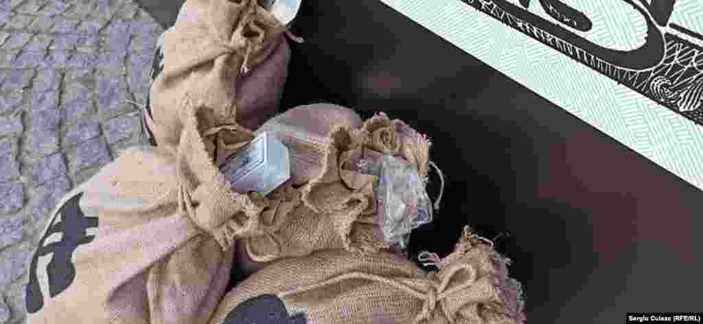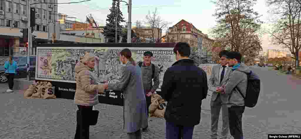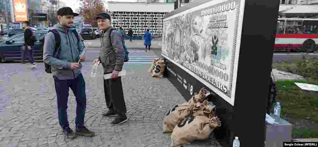 Opt saci cu "bancnote" în valoare de un miliard de dolari și un panou lung de șase metri au fost amplasate peste drum de sediul BNM din Chișinău. Sunt ilustrate personaje-cheie și momente legate de devalizarea sistemului bancar.