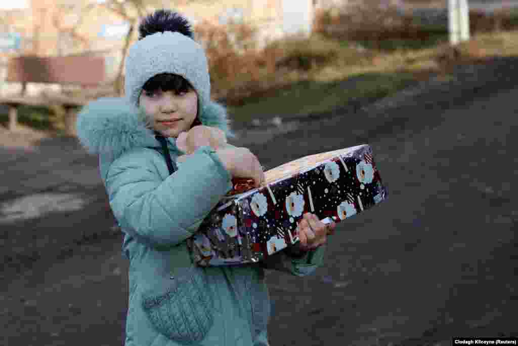 Liubov, în vârstă de 9 ani, stă la coadă la cadouri alături de bunicul ei.