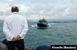 Presa rusă, nici măcar cea din opoziție, nu pomenește nimic despre asta în această dimineață, în schimb Ukrainskaia Pravda se delectează cu subiectul, informându-ne că luxosul iaht a costat 87 de milioane de euro, are 82 de metri lungime, și că este același iaht de croazieră cu care Putin l-a plimbat, în luna mai anul trecut, pe dictatorul bielorus Aleksandr Lukașenko prin Marea Neagră (cf. foto mai sus), la câteva zile numai după ce regimul de la Minsk deturnase un avion european de pasageri.