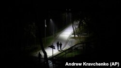 Oamenii se plimbă într-un parc în timpul unei pene de curent în Kiev.