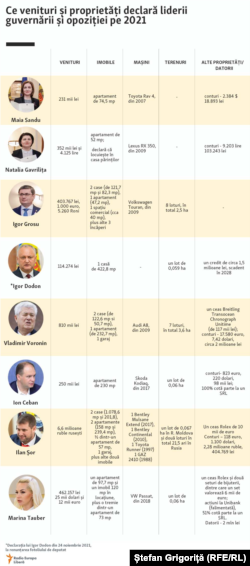Europa Liberă a sintetizat într-un infografic Declarațiile de avere și interese personale pe anul 2021 ale celor mai înalți demnitari și ale liderilor opoziției.
