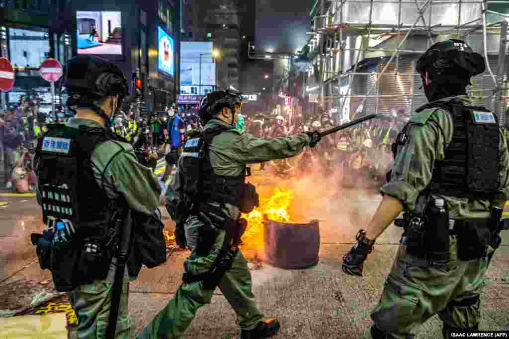 Oamenii folosesc umbrele pentru a se proteja de proiectilele cu gaze lansate de poliție, Hong Kong, 27 mai 2020