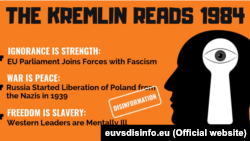 Acest model e oglindit în instituțiile de azi ale dezinformării pro-Kremlin. „Rusia a fost dintodeauna în război cu nazismul”. Aflăm, de exemplu, că Uniunea Sovietică a început eliberarea Poloniei ocupată de naziști în 17 septembre 1939. “„Acela care controlează trecutul controlează viitorul”.