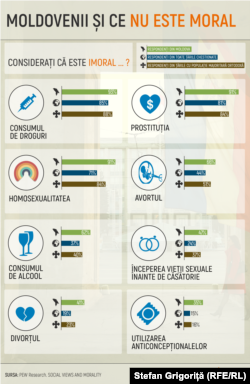 Majoritatea covârșitoare a moldovenilor consideră că este imoral să consumi droguri, să practici prostituția sau chiar să ai o orientare sexuală netradițională. Concluziile apar într-un studiu publicat de către PEW Research care se bazează pe o serie de sondaje efectuate în luna iunie 2015 - iulie 2016.