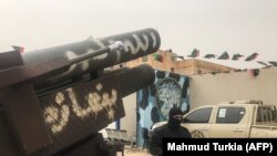 Membru al Armatei naționale libiene (LNA) sub comanda lui Khalifa Haftar, țintește fotografia președintelui turc Tayyip Erdogan prinsă de un vehicol blindat pe care LNA susține că l-a capturat în timpul luptelor din Tripoli, în Benghazi