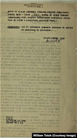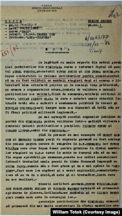 Subsemnatul William Totok, scriitor german din România, mă adresez dumneavoastră, tovarăşe preşedinte, în mai multe probleme legate de evoluţia progresivă a reprimărilor la care sînt supus şi mai ales la intensificarea persecuţiilor din ultima perioadă, care, se pare, evoluează în mod abuziv: