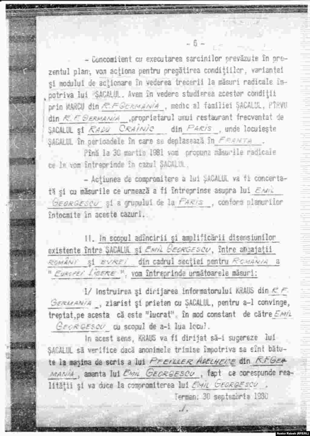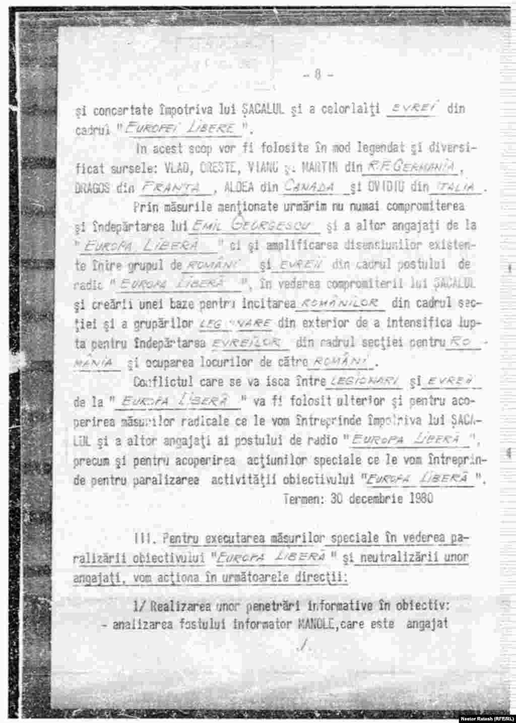 Romania, former Securitate document detailing violent measures to be taken in the 1980s against RFE/RL's Romanian department director at the time Noel Bernard, 5nd page